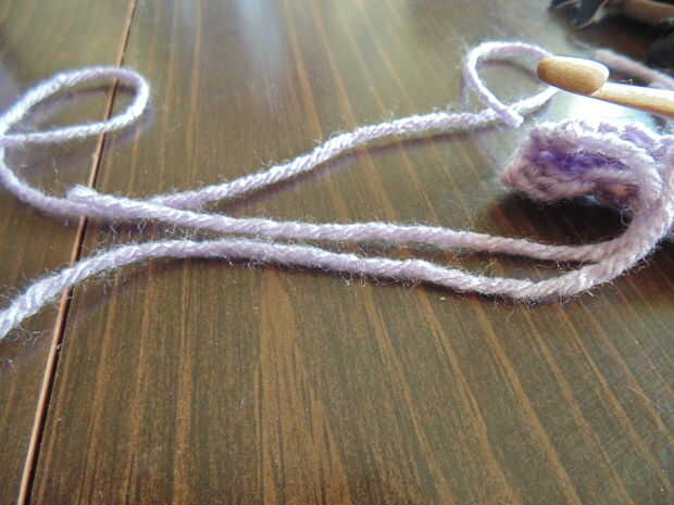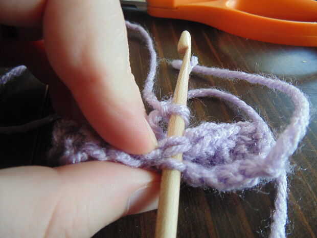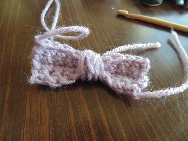 Para ate, utilizando su gancho del ganchillo para tirar a través de la parte inferior, envolver la cola a través de la corneta 2 veces