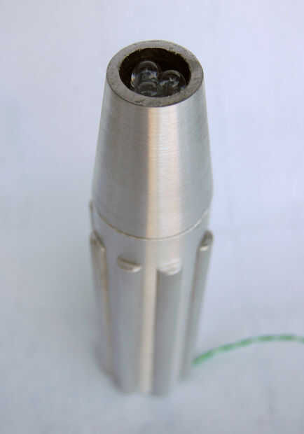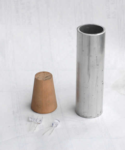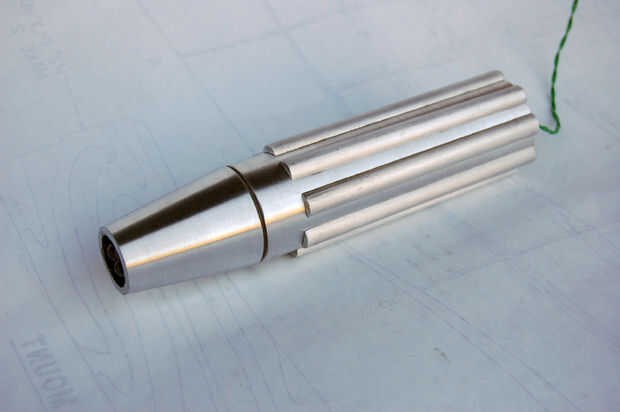 El emisor es tubo de aluminio con ajuste de aluminio. La punta del cono se hace de una pierna de madera muebles de Home Depot. Para aluminiza el cono, ajustaron una piel de aluminio en el exterior.