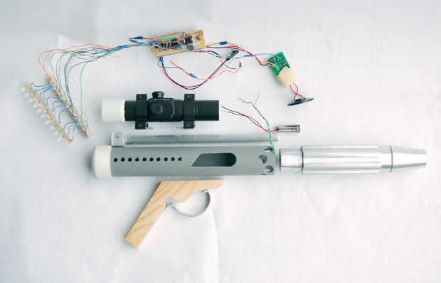 Construí mi Blaster de PVC, tubería de aluminio, pedacitos de chatarra de aluminio, aluminio de la hoja, madera y varios pedacitos y adornos que yo tenía por ahí. Si usted decide construir una blaster Star Wars, hay plantillas disponibles que te ayudarán con el lalyout. Usé la plantilla se relaciona en la parte superior de esta página en el foro de Club del constructor de Blaster para hacer el tubo receptor, guardamonte y revista vivienda.