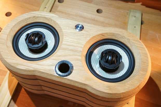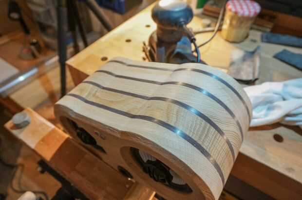 Después de todo, se pega pude configurar sobre lijado y raspado todo suave y al ras. Primero pegué el panel frontal para el resto de la caja con los altavoces y ya instalados. ya que sería difíciles de fijar una vez estuviera pegado al resto de la caja. Entonces había chaflanado de los bordes del panel posterior y los orificios perforados y había atornillado a la caja. Todo esto podría entonces ser afianzado con abrazadera en un vicio y utiliza una combinación de papel de lija y un gabinete raspador para obtener todo la superficie perfectamente lisa y al ras. También podría utilizar un papel de lija fino para heladas sobre los bordes del policarbonato para difundir la luz azul que voy a añadir más tarde.