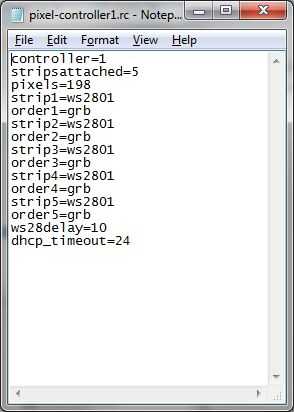 En cualquier caso, necesita escribir un archivo llamado pixel.rc a la PixelPusher que define qué tipo de LED utiliza, varias opciones de sincronización y otras opciones avanzadas para encadenar múltiples controladores de PixelPusher juntos. Un buen post con todas las opciones disponibles para la configuración de pixel.rc está disponible aquí. Puede encontrar más información para configurar el Hardware del PixelPusher en la Guía de configuración de Hardware de PixelPusher.