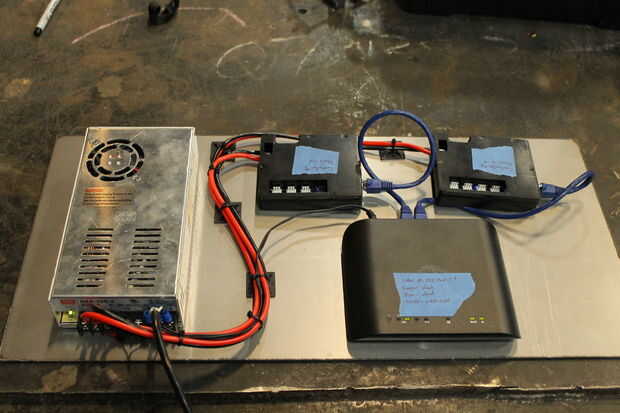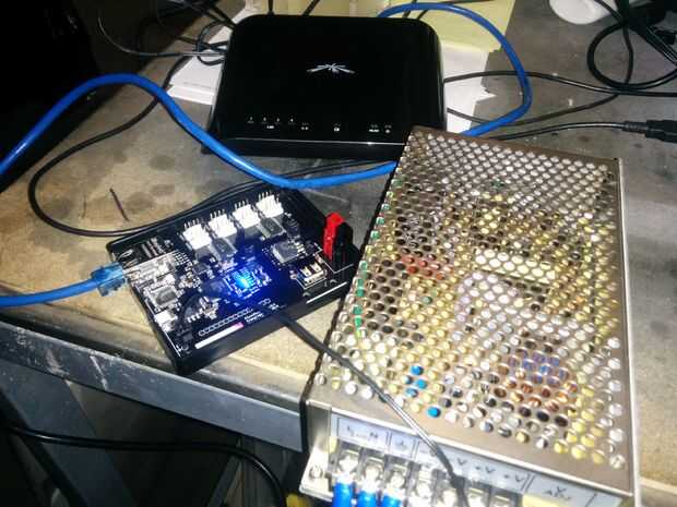 Este paso es simple - conecte su pixelpushers a la fuente de alimentación de tamaño correcto y asegúrese de que todo funciona como se esperaba. Si observas de la imagen de arriba, nuestro router Ubiquiti también se alimenta de 5V, para que podamos todos los 3 dispositivos de una sola fuente de alimentación de energía y sólo tiene 1 enchufe en nuestra instalación en la pared!