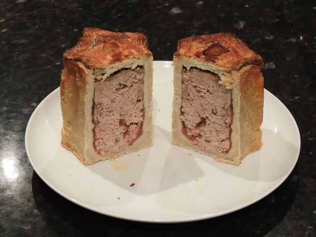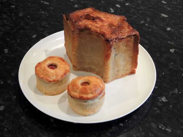 un clásico pastel de carne de cerdo inglés tiene una masa quebrada de agua caliente formado de mano, un relleno de carne de cerdo picada o en trozos pequeños, carne sazonada sólo con sal y pimienta y rematada por con jalea, añadido después de la cocc