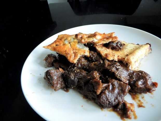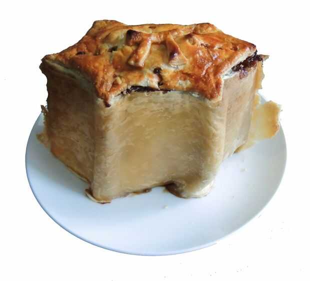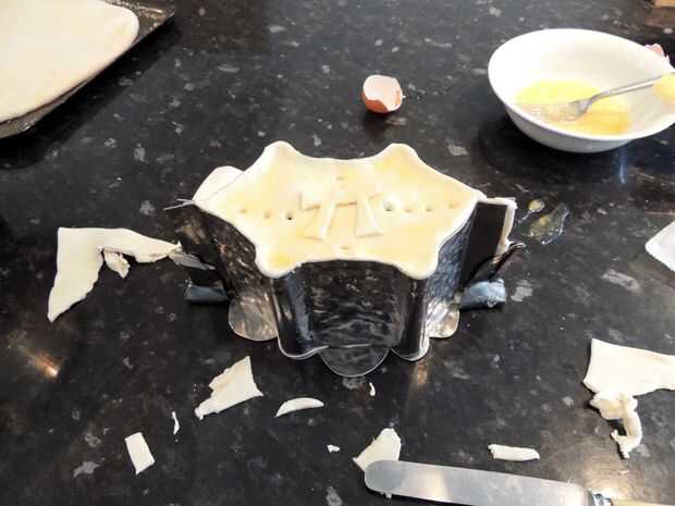 En honor a esta rareza, hice otra tarta en el molde, decorado con un pi de masa, que parecía apropiado. Utilizar masa de hojaldre. Grande en la parte superior, pero no realmente lo suficientemente fuerte para los lados. Esto era especialmente cierto ya que era un pastel de bistec y riñón que tiene mucho más líquido de relleno de la empanada de cerdo relleno de jalea.