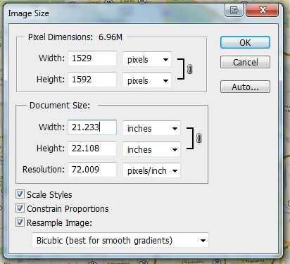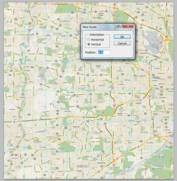 Ahora vamos a imagen -> tamaño de la imagen y echa un vistazo a las dimensiones de la imagen en pulgadas. El mío es 21,233" por 22,108" y tengo que poner líneas de división horizontal la imagen en 8 pedazos y 6 piezas verticalmente, por lo que cada 21.233 / 8 = 2,654" por 22.108 / 6 = 3,685" debe ser una intersección. Ir a la vista -> nueva guía... y hacer una guía vertical nuevo en 2,654". Entonces hacer una nueva guía en el doble que una tercera guía en triple a y así sucesivamente. Hacer lo mismo para las guías horizontales pero 3,685" como un espacio en su lugar. Copiar las líneas que marcó y moverlos a las líneas de guía. Luego ir vista -> Guías claras para deshacerse de ellos.
