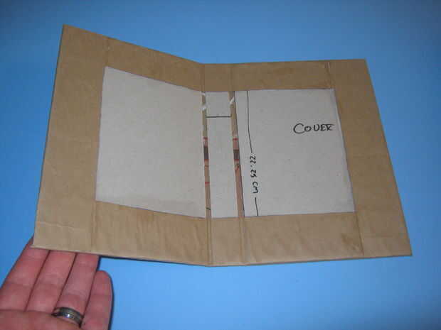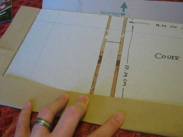 Una vez que las cubiertas se han secado completamente en el papel y el papel se ha reducido al tamaño correcto, voy ahora envolvemos las cubiertas. Para hacer este primer doblez cubrir cada extremo del papel en el interior. Mientras sostiene firmemente el papel hacia abajo, marcar el borde con un lápiz. Hacer esto por los cuatro costados.