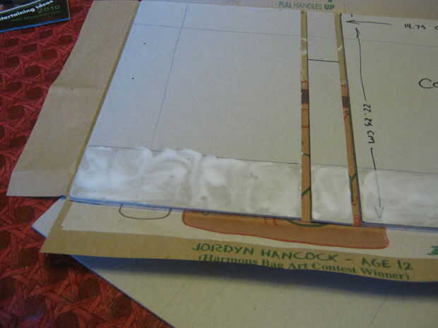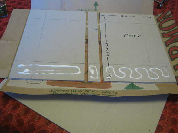 Pegamento extensión sobre la cubierta mantiene el pegamento dentro del área a ser cubierta por el papel, esta es la razón para marcar los bordes. Una vez que han cubierto la tapa con doble pegamento cubra el papel en el interior. Hacer esto por los cuatro lados y deje que se seque completamente.