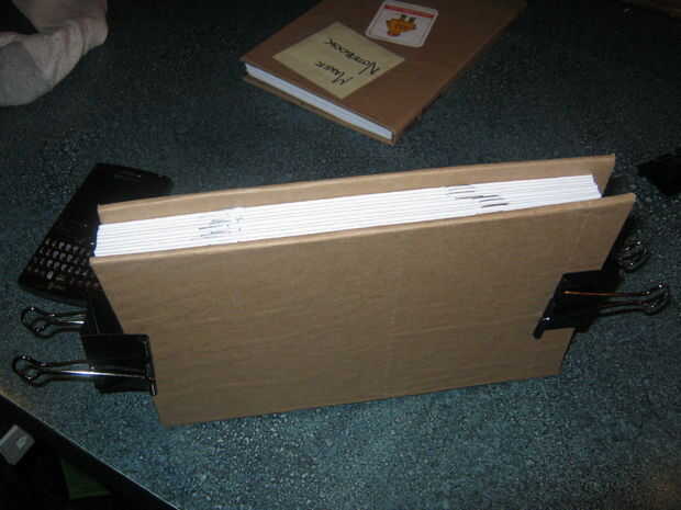 Una vez la combinación que conforman el manual se lleva a cabo junto con grapas es el momento de llevarlos todos juntos. Apilarlas juntas en orden y en posición vertical. Probablemente usted notará que el cuaderno es un poco más grueso hacia la columna. No es difícil ver por qué. Para solucionar esto se pulsa la columna firmemente juntos en un hacer cambio vice. Para ello utilizaremos la cubierta del libro finalizado, dos clips y unas bandas de goma.