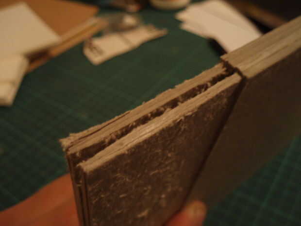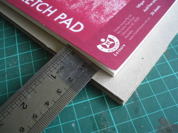 2. para hacer el sit de la espina dorsal de cuero al ras con el producto terminado, necesitamos "cincel" las áreas de la cubierta que va a tener una columna vertebral. He decidido tener una columna de 50mm de cuero en la tapa. Puntuación a lo largo de una línea de 50mm desde el borde de la columna vertebral. Con la cubierta del borde marcar una línea aproximadamente 1-2mm en la tarjeta gris (esto variará dependiendo del grosor de la piel que usted tiene).