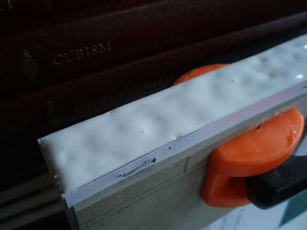 2. cortar una tira de algodón aproximadamente 3 veces la anchura de los espesores totales de la página y pone la mitad del algodón sobre las páginas para absorber el pegamento PVA. Los bordes del algodón también serán doblados encima.
