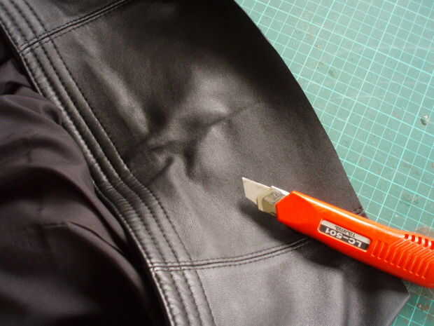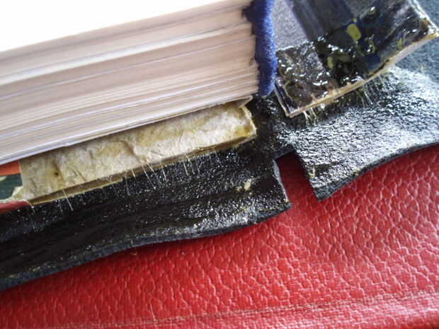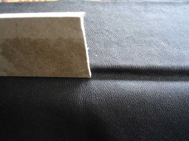 3. repetir para la columna vertebral, asegúrese de que el cuero esté colocado en el hueco entre la columna y la cubierta. Yo uso un trozo de cartón para presionar este abajo.
