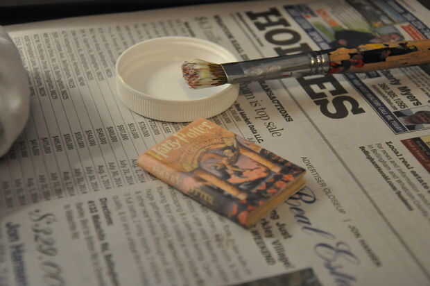 Una ligera capa de Mod Podge en el frente y la parte posterior de la pieza de madera del cepillo, luego coloque la tapa en él. Usando su uña o un borde recto, Coloque suavemente la cubierta en los pliegues en el delanteros y traseros cerca de las espinas, teniendo cuidado de no para rasgar el papel.