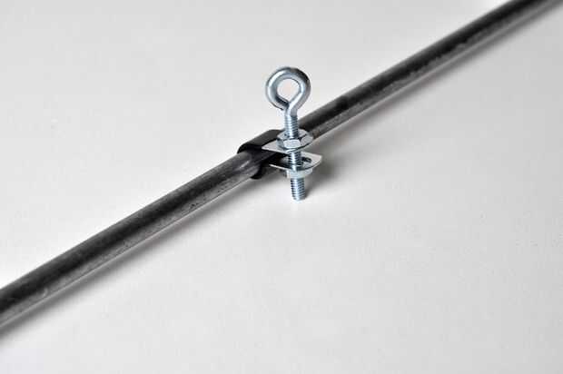 Poner una abrazadera de telar en cada uno de los seis puntos etiquetados A la f el. Para ello, deslice la abrazadera sobre la barra y deslice en su lugar. Luego inserte el perno de ojo y apriete las tuercas.