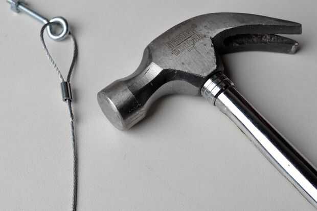 Uso de férulas, conecte un cable al centro de la parte superior de la barra (B). Este se coloque en el techo, así que asegúrese de que es bastante larga. Luego conecte un cable a cada uno de los extremos de la barra superior (A y C). Para sujetar los cables, inserte el cable en la abrazadera, lazo a través del perno de ojo y vuelva a insertarla en la virola. Golpee la férula con un martillo para sostener el cable en su lugar.