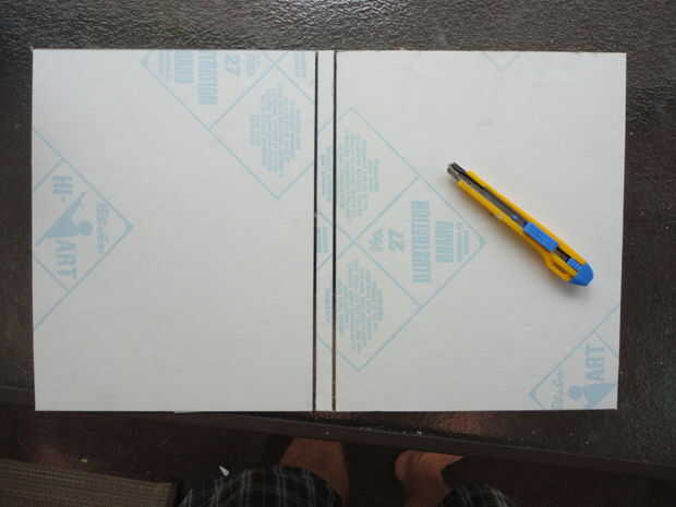 Usted tendrá que cortar dos piezas un poco más grandes que sus páginas. 2-3mm extra. Y también una franja que coincida con el grosor de tu libro.