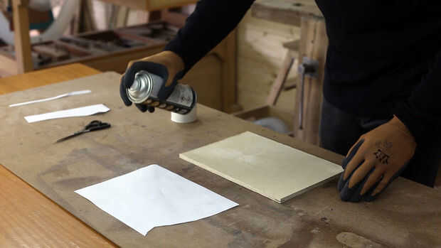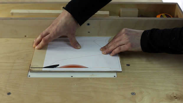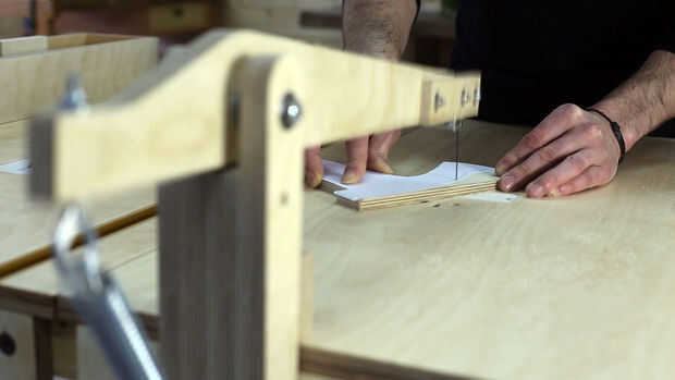 Iniciar la impresión de la plantilla. Puede descargar los planos para libre aquí. Pegamento en la hoja de madera contrachapada. Cortar la base en la Sierra de mesa y las piezas curvas en la Sierra de calar.