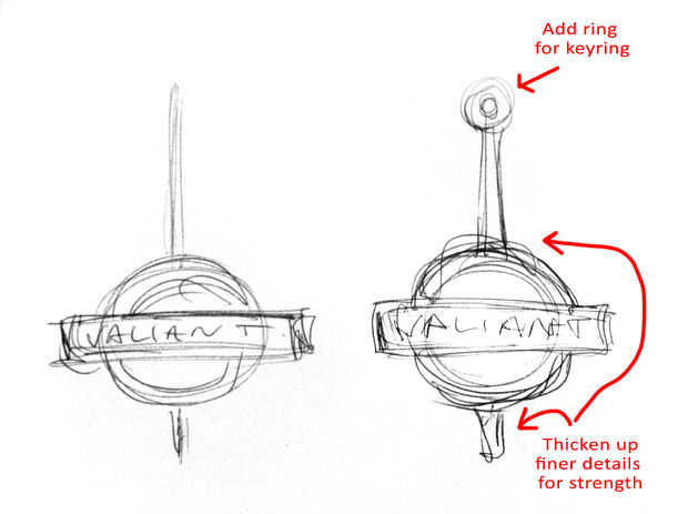 Puño arriba esbozado en papel elaborar si funcionaría y qué partes del diseño necesitan modificarse. Había en la foto esta cosa en mi cabeza muy bien, pero este es un buen paso para ver qué problemas puede tener. Básicamente todo lo que se necesita aquí era para engordar las partes más delgadas del diseño y agregar un loop de llavero. Como este fue mi primer intento en impresión 3D me tendió a er en el lado de la precaución y había espesado todo para arriba un poco.