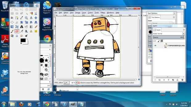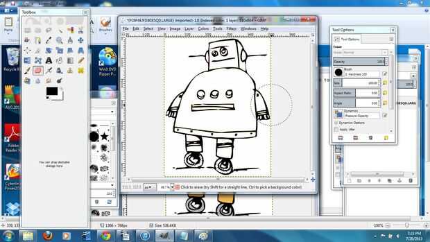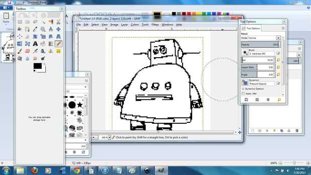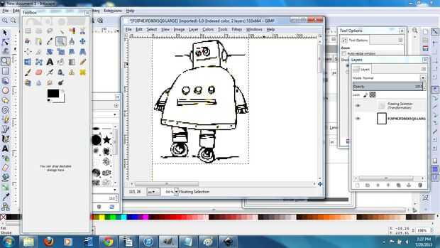 Este es un proyecto fresco, porque vamos a usar tanto gráficos vectoriales (corte) y raster (grabado) . Empecé con una imagen de robot de Instructables que encontré aquí. Hay algunos enlaces en esa página que te llevará a fotos robot ligeramente diferente. Descargué el archivo .gif y abiertos en el GIMP1. Este es un programa de código abierto similar a photoshop