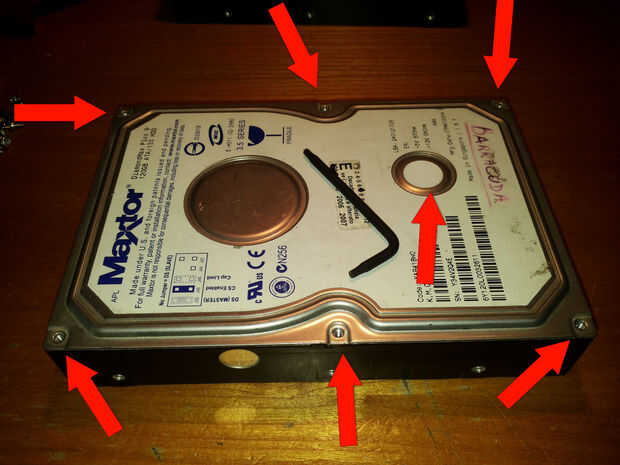 -con el destornillador quitar los 7 tornillos que sujetan la cubierta superior del disco duro