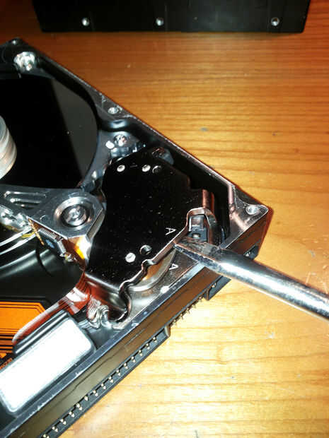 -mover la cabeza hacia la izquierda para que esté libre de los discos y con el destornillador plano, retire el tornillo central que sostiene la cabeza