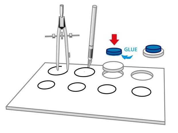 Si no tienes cualquier tapas de botellas, puede cortar el medio disco de cada rueda de la misma cartulina.