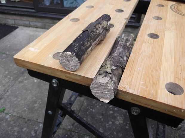 Elegir un tronco bonito y corte limpiamente en dos. Para un mejor resultado intentar mantener el corte agudo, la Plaza y evitar golpear la corteza apagado (difícil!).