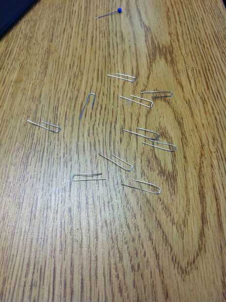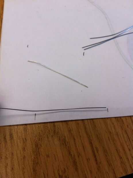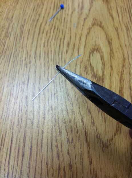 Había marcado mi longitud en un pedazo de papel y había utilizado esto como un indicador para cortar el alambre. Entonces agarré el cable cerca de la mitad, con los alicates y dobla el alambre en una "grapa" a mano.