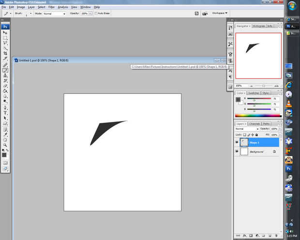 Ahora, salir de la herramienta de pluma (atajo "p"). Dibujar una línea con él, entonces agarra el punto donde la línea y arrastre un poco. Si todavía no entiendes esto, jugar un poco con la herramienta pluma y lo obtendrás. Es una habilidad valiosa para tener. La imagen ilustra lo que terminé para arriba con forma de lápiz muy básico. Si no ya lo tienes, asegúrese de que la forma se rellena con negro, o más oscuros que vas a ir con cualquier color te están usando.