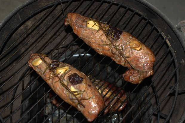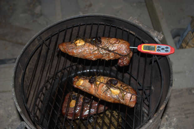Comencé a comprobar sobre cada 20 minutos y una vez que la carne de cerdo llegó a 170 grados y el venado llegó a 145 me quitan el carne de la parrilla.