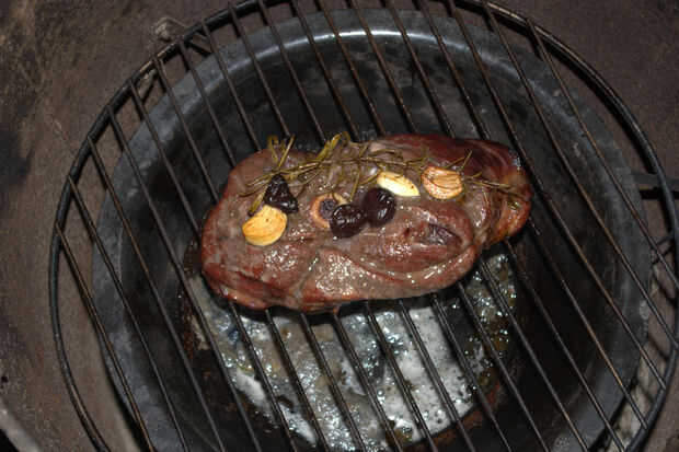 Retire cuidadosamente la carne! Guardar el ajo y cerezas! Envolver la carne, ajo y cerezas (el Romero puede ser sacudido o guardado para decorar) en papel de aluminio y reservar.
