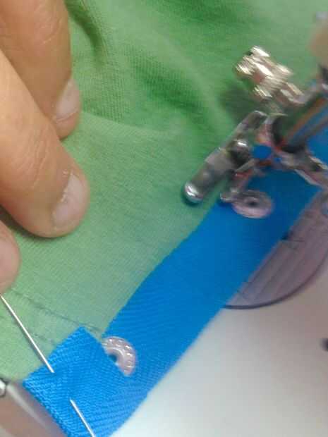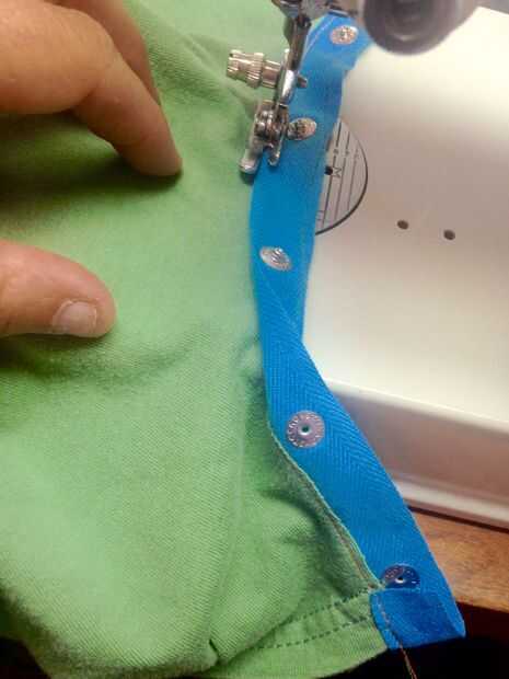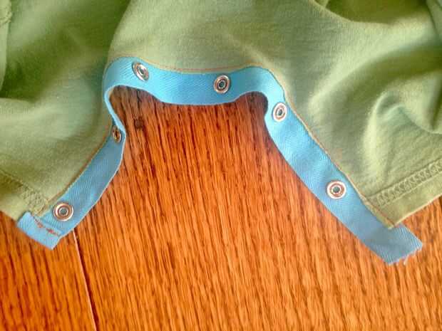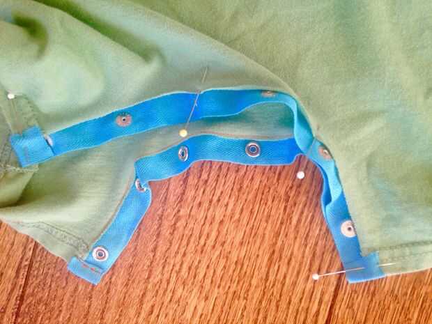 Ahora para la cinta de cierre. Comience primero con la parte delantera del mameluco. Rápido sin su complemento cinta y uso el extremo receptor de la cinta de cierre para el frente (el lado más plano de la presión). Coloque el borde del lado equivocado de la cinta de cierre en la parte superior del lado equivocado de romper con el lado equivocado del snap, mostrando. Deja 1/2" o la cinta colgándose el dobladillo en ambos lados por lo que se puede doblar este borde sobre para acabar con. Ahora coser en el revés de la tela, justo en el borde. En la parte posterior! Empezar por ajustar la cinta detrás juntos. Con la espalda hacia arriba, al revés de la parte del pezón de la cinta en el interior del revés de la tela trasera del perno, debe verse la parte posterior de la presión. Ahora sin ajustar la cinta y el pliegue extra de cinta en el dobladillo sobre la derecha y la clavija allí. Ahora la t a la derecha de la cinta en el borde de la puntada. Casi ha terminado! Ahora plegar el lado del pezón de la cinta de resorte para que el lado derecho de la cinta y el lado derecho de la te están mostrando y coser el otro lado de la cinta hacia abajo. Clip de su rosca y listo la parte de romper de este proyecto se hace!
