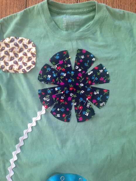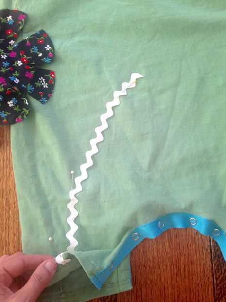 Usar tus retazos de tela para cortar una linda flor. Comience con una longitud de la rejilla de rick para la madre. Prender esta al frente del mameluco. Doble el borde inferior del tallo para un final agradable y luego coser el tallo hacia abajo. Ahora coser en la flor y el punto centro, clip tus hilos. No te preocupes los bordes crudos, cuando usted lava el mameluco se debilite y agregar un poco algo extra a la mirada entera.