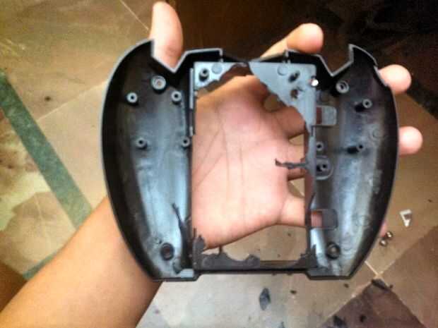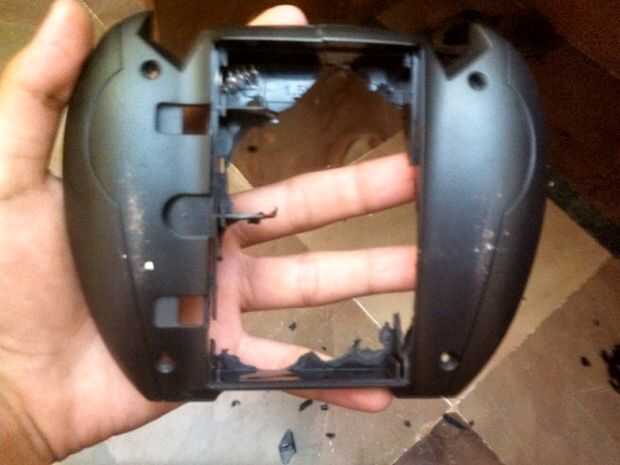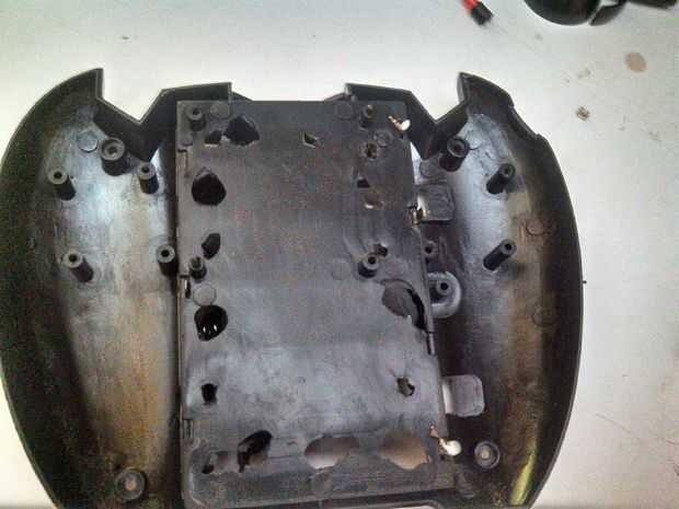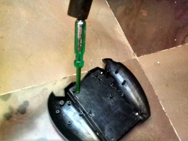 ahora tomar el menos destornillador y con la ayuda del martillo meter muchos agujeros en el margen del área de la batería del control remoto como se muestra above.after que usar el martillo y romper el área entre el área de los orificios penetra/atornillados. (Nota: - no es necesario utilizar el destornillador y el martillo también puede cortar calentando un cuchillo y luego cortarlo,.)