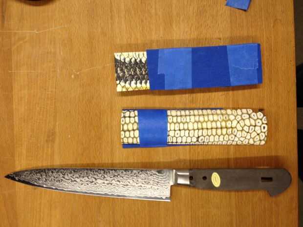 Preparar sus escalas de la manija y corte hasta una plaza con 1.5 pulgadas de material adicional alrededor de la manija de la hoja. Usar el lápiz trace el borde de la hoja de mango en sus escalas de la manija.