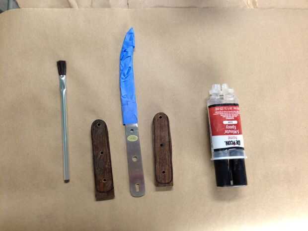 A continuación, preparar su epoxi y con un pincel aplicar una capa ligera y constante de epoxi sobre el mango de la escala primera. Fíjela a la manija de la hoja de metal. Luego empuje los pernos a través de los orificios perforados para llevar la madera y el metal en su lugar. Finalmente la otra mitad de la escala de asa de Epoxy y conectarlo, sobre los alfileres extrudados al otro lado de la manija del metal.