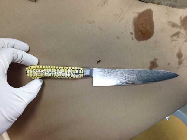 Como se puede ver, este mango de cuchillo de maíz ha visto días mejores. Faltaba uno de los remaches y estaba envuelta en cinta aislante para sujetar juntos. El mango está en tal mal forma hizo una herramienta peligrosa. Es definitivamente cierto más