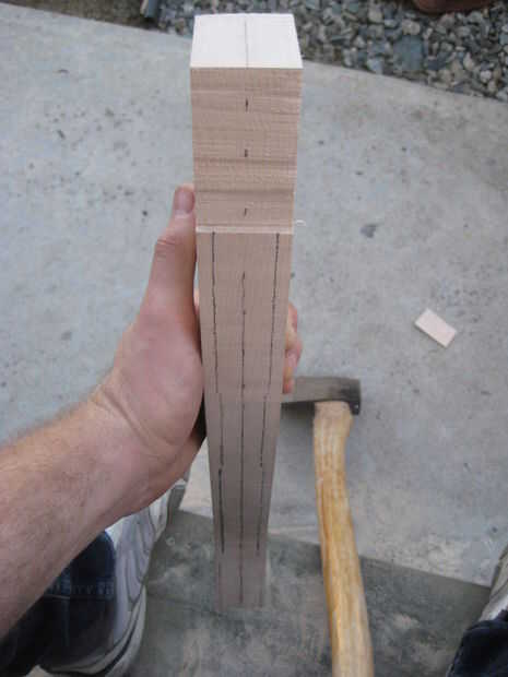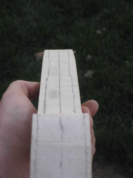 Después de cortar el mango, mide el espesor de un hacha de la culata hasta la parte superior. El mango reducido naturalmente en el medio el hacha como usted necesita un final más gordo para retener así como un extremo más grueso donde inserta la cabeza del destral de la. Transfieren estas medidas sobre el mango en la proporción correcta que estaba haciendo en (es decir el cuarto del fondo era uno de anchura, así que hice mi fondo cuarto de eso anchura así y así sucesivamente hasta el hacha). Estas líneas se utilizará para ayudar al hacha de la forma en la forma apropiada durante el uso de la lijadora de banda y muela de matriz. Mis medidas son las siguientes