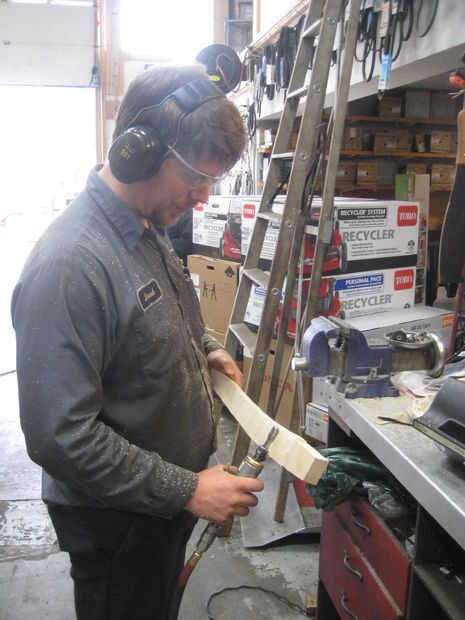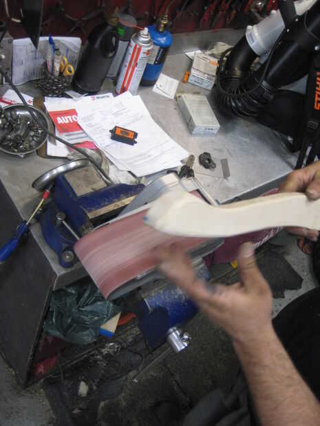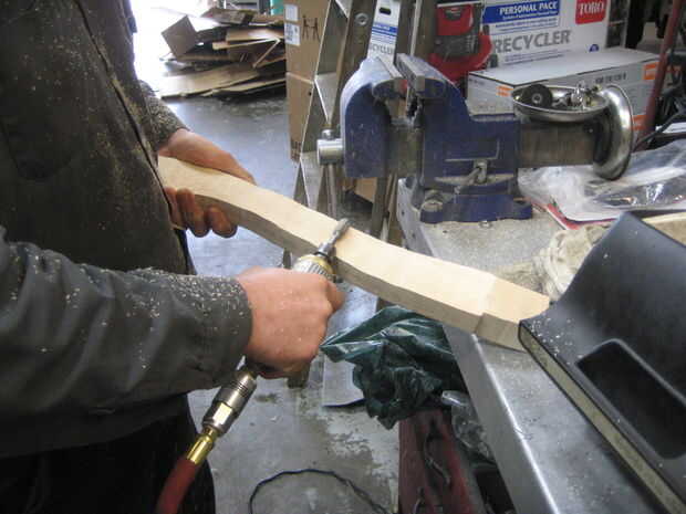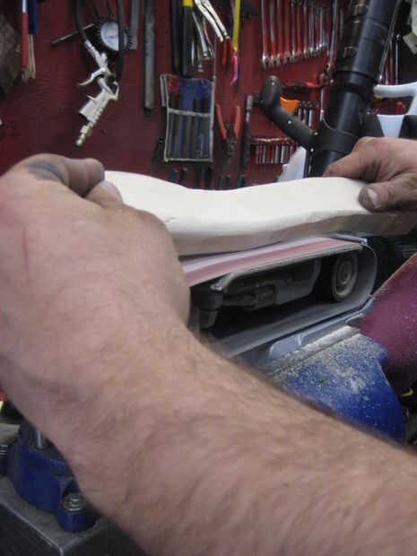 Después de hacer la parte de grueso, pude empezar a redondear los bordes de la madera con una lijadora de banda montado boca abajo en un vicio. Esta es la manera más fácil sobre todo si tienes un seguro del gatillo... El mango realmente empezaron a llegar juntos ahora que estaba buscando como un mango real. El truco aquí es igualmente redondeo la manija en ambos lados, que era más fácil de hacer si largo secciones y secciones no solo un poco a la vez. Quisiera quitar poco a poco y constantemente Deslice mi mano arriba y abajo de la manija para ver cómo se sentía en mi mano. La mano es increíblemente sensible a los defectos en el contorno de la madera y rápidamente se puede sentir que necesita quitar más madera.