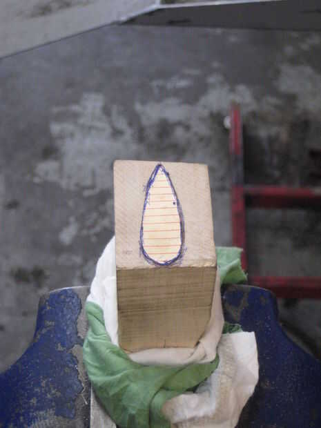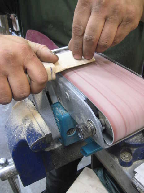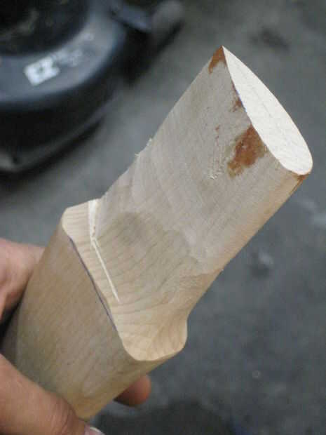 La parte superior de la empuñadura debe ser cuadrada como usted desee la cabeza montada. Esto fue difícil para mí como la cabeza tuvo que ser un poco fuera de juego al mango porque hacha que corta están hechos para los usuarios de la manos derecha o izquierdos, así sería no interferir cuando intenta un registro de la Plaza. Después de trazado que en el la parte superior del mango, cortar un poco fuera de la línea una vez más ya que es más fácil quitar la madera que to probar y hacer para arriba para ella durante el montaje de la manija en el ojo. Rectitud es muy de importación de aquí y yo tenía un amigo que me mira como que corta el esquema que dibujó en el hacha de guerra. Desea que la parte superior de la empuñadura al ser tan ceñido como usted puede hacer mientras se inserta todo y más allá de la parte superior de la cabeza del hacha. Esta parte sobrante que se pega a través será tierra apagado después de montar la cabeza de hacha... Después de cortar hacia fuera, una vez más fui a la lijadora de banda como se quita madera lentamente ayudar a hacer que encaja perfectamente en la cabeza. Esencialmente cabe la cabeza en la parte superior del mango y luego en seguir abajo de la manija para permitir que la cabeza se deslice más. Puedes ver las marcas marrón oscuras en la parte superior de mi mango resbale la cabeza encendido y apagado que me mostró donde estaba frotando el mango dentro de la cabeza. Este paso tomó apenas mientras que forma el mango porque estaba preocupado por hacer caber cómodamente por lo que el hacha de guerra madera nunca accidentalmente volar la cabeza.