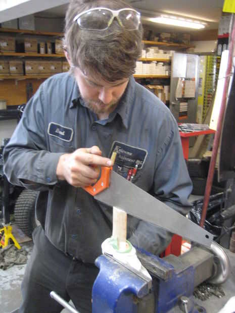 Una vez más, la alineación es muy importante aquí. Tienes que dibujar líneas a lo largo de sus centros de la parte superior del mango para asegurarse de que la sierra no va fuera de pista. Una vez más tenía un amigo ayuda por que me mira y asegurándose de que estuve cortando recto. Esta es la parte que esencialmente abocardará hacia fuera una vez una cuña en el corte para ayudar a sostener la cabeza. Si paso cinco correctamente, esta parte del hacha de guerra debe extenderse por el ojo del hacha de guerra por alrededor de 3/8 de pulgada. Más adelante puede ser izquierda o tierra apagado en el paso final. Este corte debe ser alrededor de mitad de camino por esta parte. Por ejemplo, si tu hacha es 3 pulgadas de un extremo del ojo al otro, quieres hacer un corte de 1 1/2 pulgadas de largo y 3/8 que tenía pegado a la parte superior. Así que se requeriría un total de 1 7/8 de longitud de corte. Si el corte es demasiado largo, puedes arriesgarte a romper la parte que solo corta a través cuando se conduce en su cuña final debido a que doblar mucho. Si el corte es corto, no habrá suficiente aire en el extremo para sujetar con seguridad en la cabeza de hacha.