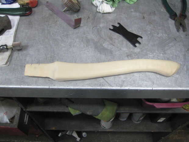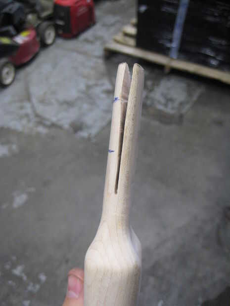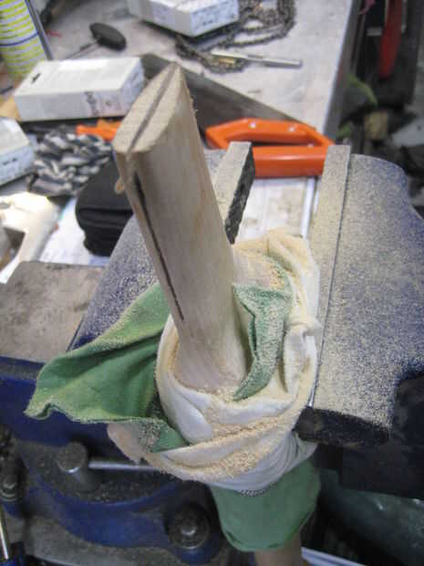 No estoy 100% seguro donde he conseguido la parte, pero estoy seguro de que leí en alguna parte que usted puede esencialmente "paso" su corte para que tu cuña se forma en el fondo de su corte y aferrarse firmemente la cabeza. Dividí el total a 3 secciones. Con el primer corte que hice, me fui toda la longitud. Con el segundo corte, sólo fui por 2/3 y con el último corte, bajé sólo un tercio. Así que, básicamente, el fondo es tercero sólo uno vio hoja ancha, que el tercio medio es dos hojas ancho de sierra y el tercio superior es tres cuchillas ancho. Esto debe darle un buen ajuste apretado para la cabeza de hacha de guerra y ahora debe tener un mango que está listo para el acabado y montaje.