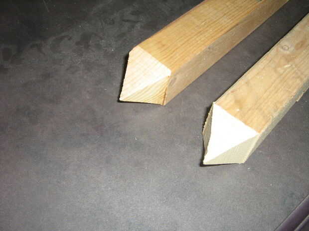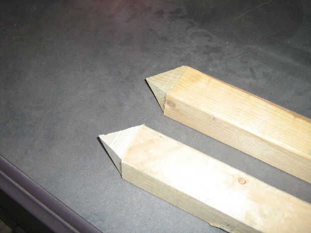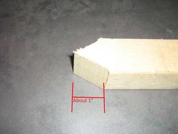 A continuación, usted necesita cortar el extremo para formar un punto. Miden aproximadamente una pulgada y media por el palo de un extremo, luego se corta desde el centro (parte inferior de la palanca) hasta esa marca. Esto es un poco difícil de explicar, pero basta con mirar las fotos.