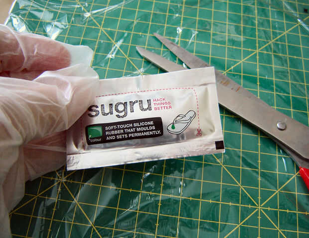 * Terminé abandonando los guantes porque es incómodo trabajar con (eran un poco demasiado grandes).  Encontré que si se aplica con agua y jabón para las manos es mucho más fácil trabajar con el Sugru.  (Solo probarlo primero ya que hay un ligero riesgo de reacción alérgica-ver paquete).
