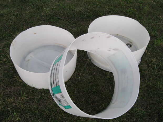 Cortar el barril en tercios con la sierra caladora. Estamos utilizando los cortes finales para revocos de tierra se mezclan en.