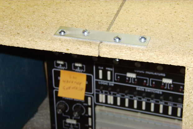 Usé dos correas (disponibles en Wal Mart o ferretería) en cada lado, uno en la parte superior y otro en la parte inferior usando tornillos y tuercas para atarlos juntos. Utilizar una placa para una plantilla de taladro. Trate de mantener la longitud del perno a una minimum(3/4"?) para que no Raspe los dedos deslizar cosas dentro y fuera.