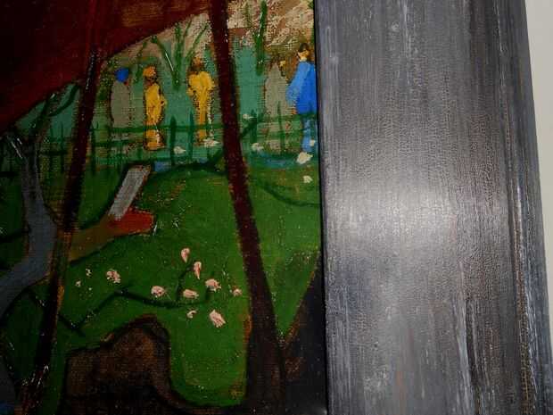 No soy un experto a la hora de elegir el color correcto de un marco para que coincida con una obra de arte. Debe considerar su color de muebles y pared, el tamaño del marco y por supuesto la pintura. Desde mi marco era grande y el cartel de vivos colores audaces seguí mi regla de oro que dice "gris va con todo". También digo para los pantalones vaqueros). Y ya que soy tan hábil con los ordenadores utilicé pintura para darme una idea de cómo vería. También he añadido un poco de verde para atar el cartel con el marco. Si te confunde a elegir un color, puede dejar como está o manchar la madera sería visible.