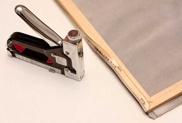 Cuando sepas cuánto tire y donde debe llegar el borde del lienzo, puede empezar a bloquear un lado corto con una grapa en el tiempo. Acabado todo el lado corto primero y luego comenzar con el lado opuesto. Aquí tienes que tirar mucho la lona, luego bloquearla con el dedo y disparar las grapas... no en el dedo! Completa con este método el segundo lado corto.