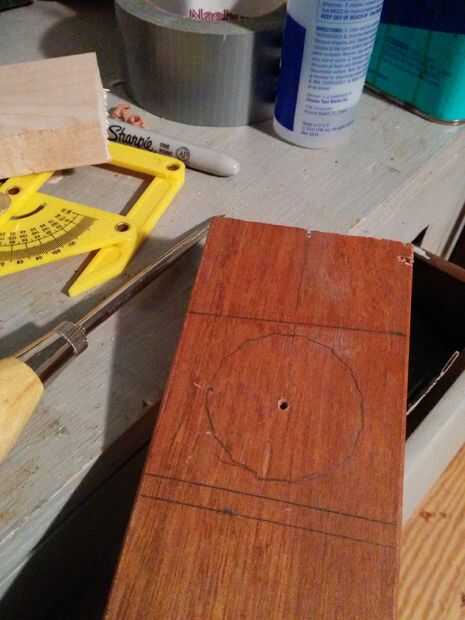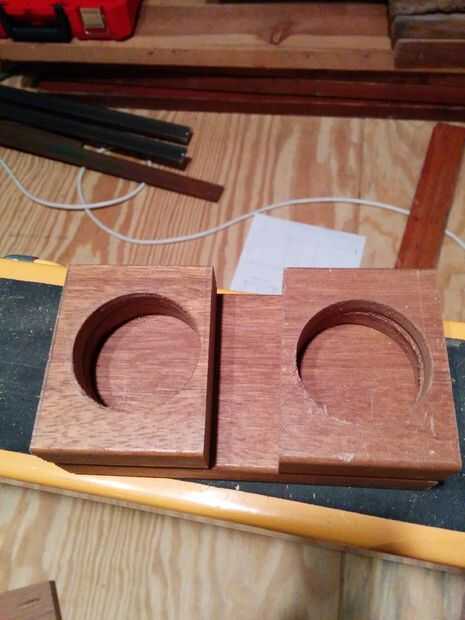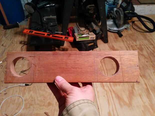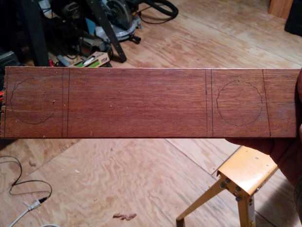 Cortaron los pedazos más pequeños, debe perforar un agujero de 1 1/2" a través del medio. Es más fácil de manejar mientras que todavía está sujeto a un tablero más largo.