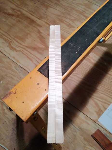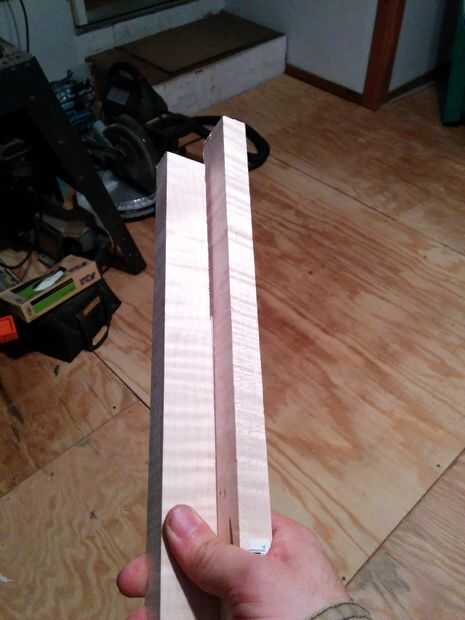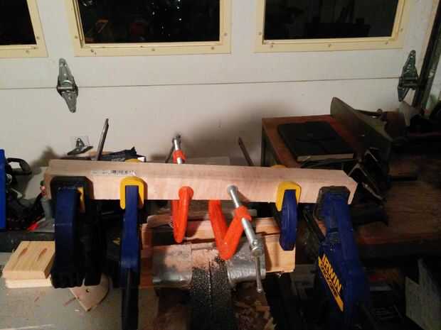 Empezar por rasgar la madera que hayas elegido para el mango justo por el medio. Deberás acabar con 2 20" largo piezas mide aproximadamente 1 3/4" de ancho. Estos del pegamento hacia arriba a lo largo de sus caras, abrazadera para arriba y les deje reposar toda la noche. Este será el espacio en blanco que utilizas para formar/talla de la empuñadura.