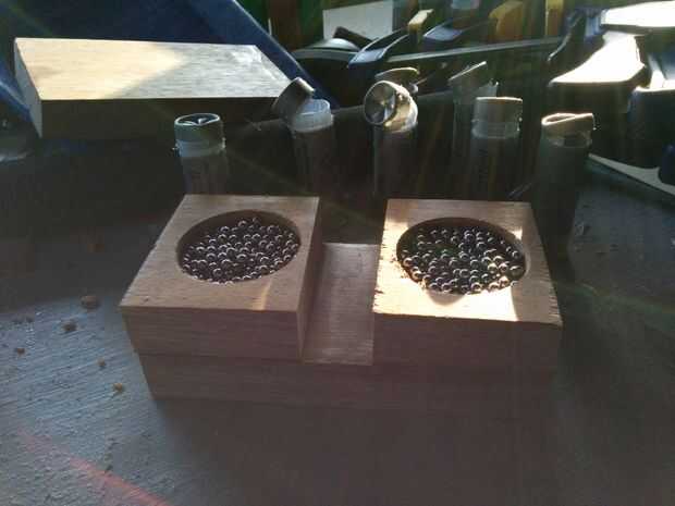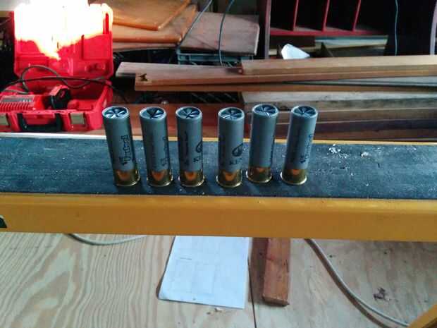 Una vez que las dos piezas más pequeñas se pegan a los 5 1/2" pieza, llenarlos con cualquier sustancia pesada se puede encontrar. Tuve algunos escopeta extra ahí así que sacrifiqué para llenar el mazo. Usted puede utilizar pesos de pesca de plomo, arena, arcilla, etc.... todo lo que tiene o puede encontrar fácilmente.
